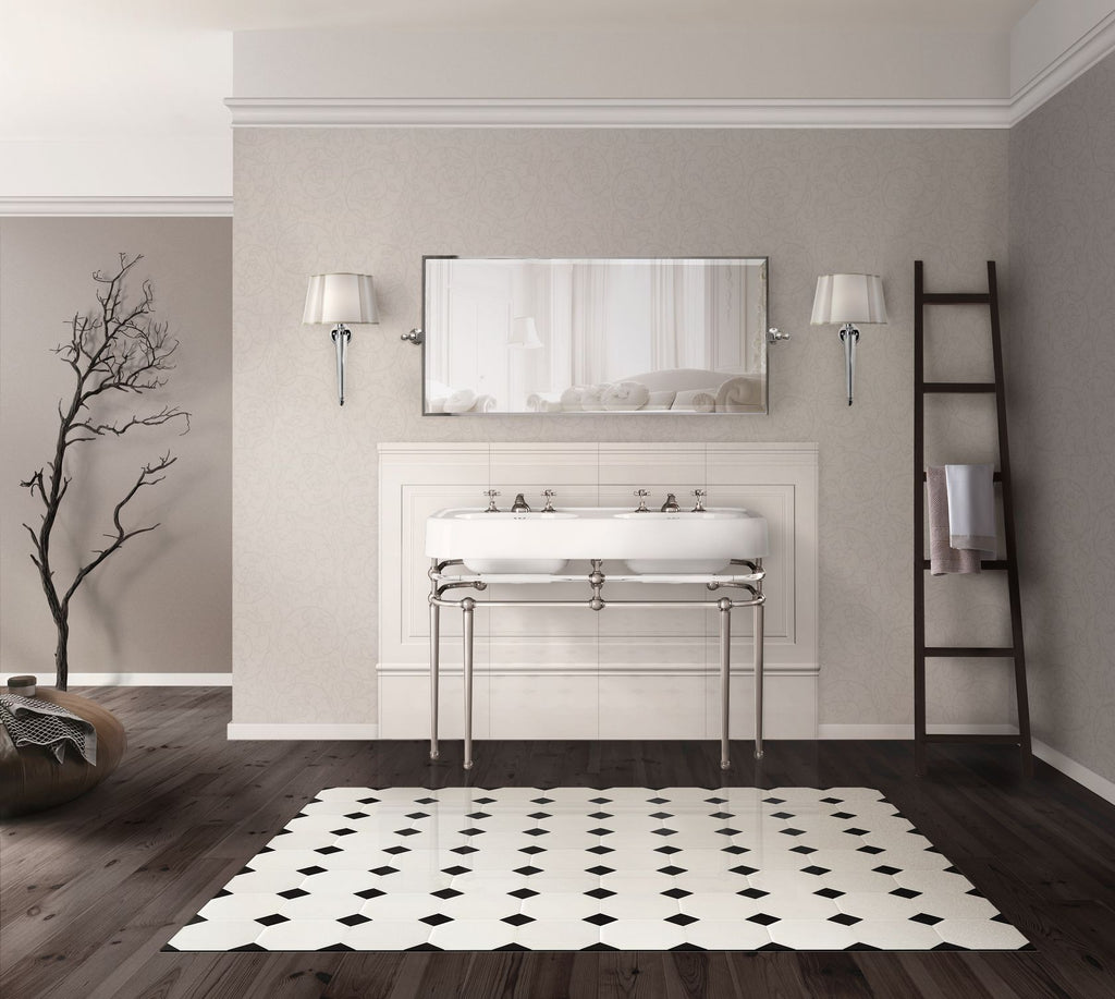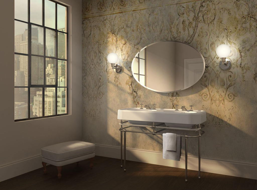 A transparent plexiglass element gives a contemporary look to the classic composition of this large console. The bearing structure in turned brass with chrome, light gold or polished nickel finishes supports an elegant ceramic sink with two large oval basins.