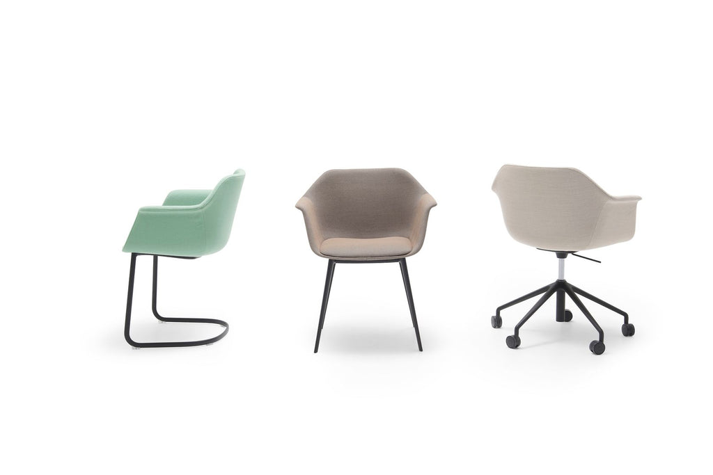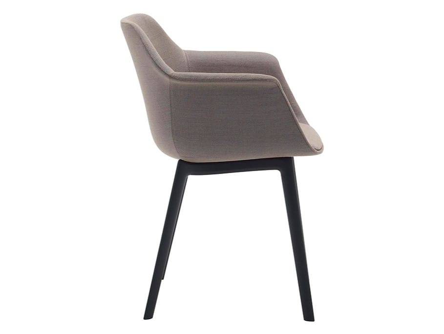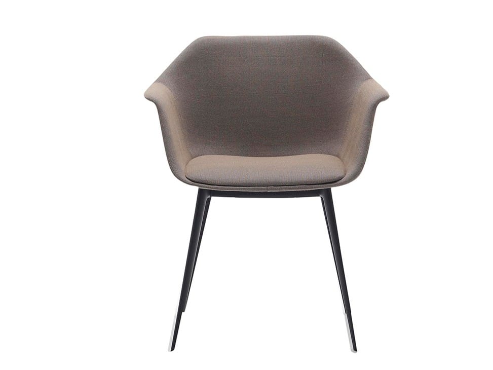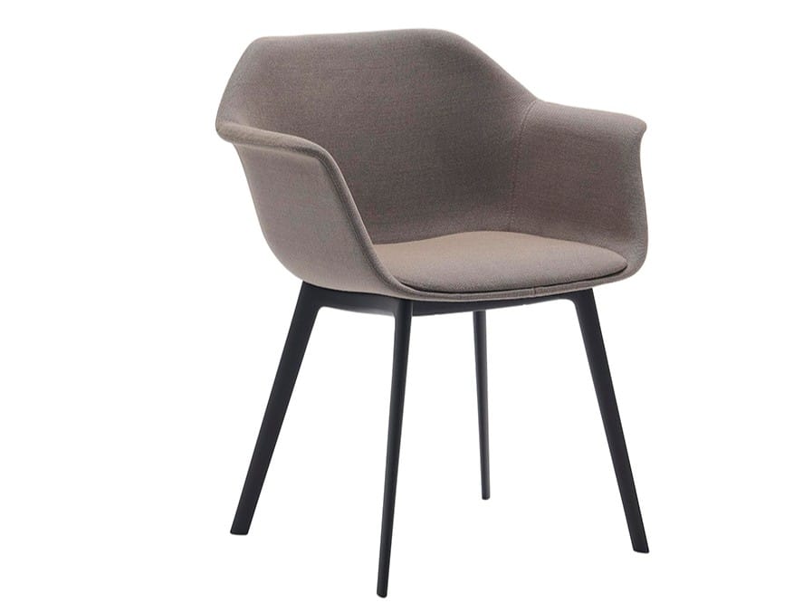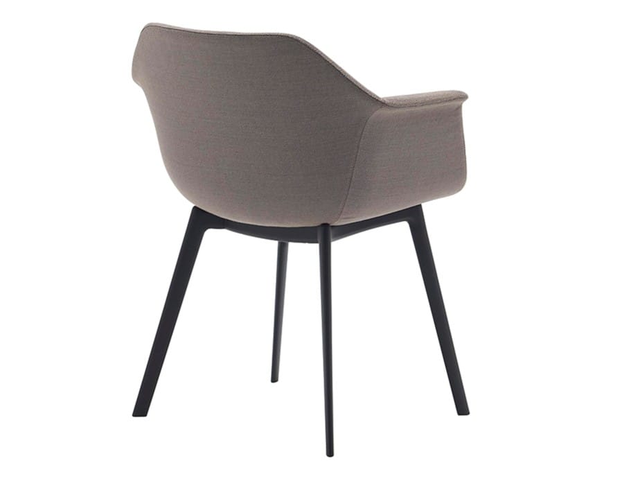 Armchair with upholstered shell and 4-legged gas injection base finishedin black or earth brown. The Gala's silhouette is reminiscent of contemporary classics, with marked and archetypal features. It is a flexible collection, fully upholstered, with many possibilities for customization thanks to an ample catalog of fabrics.