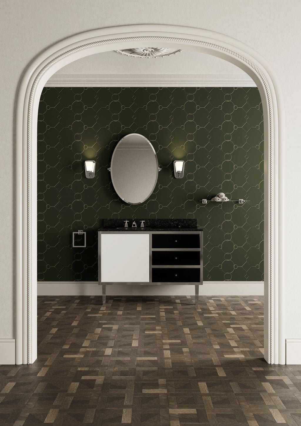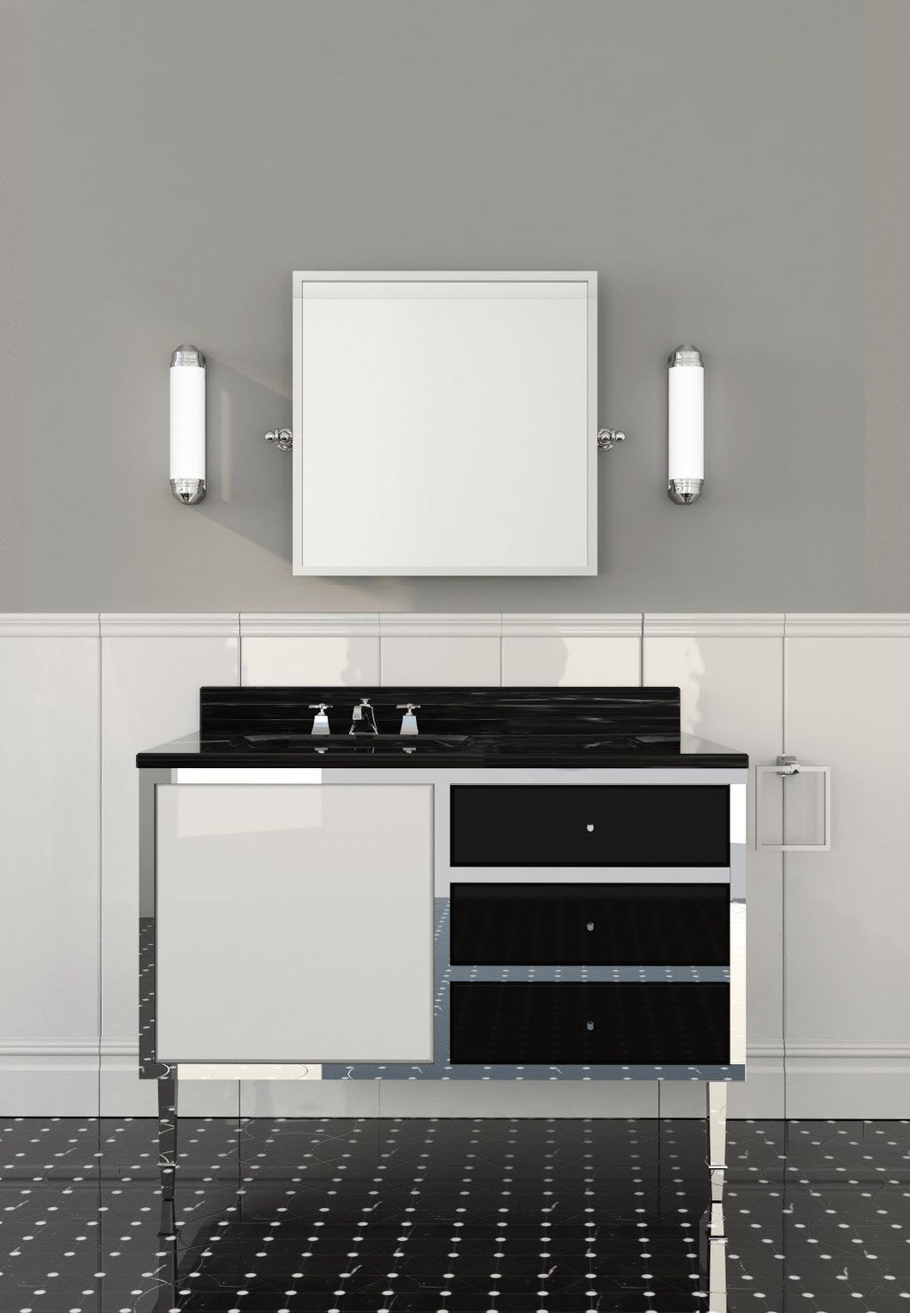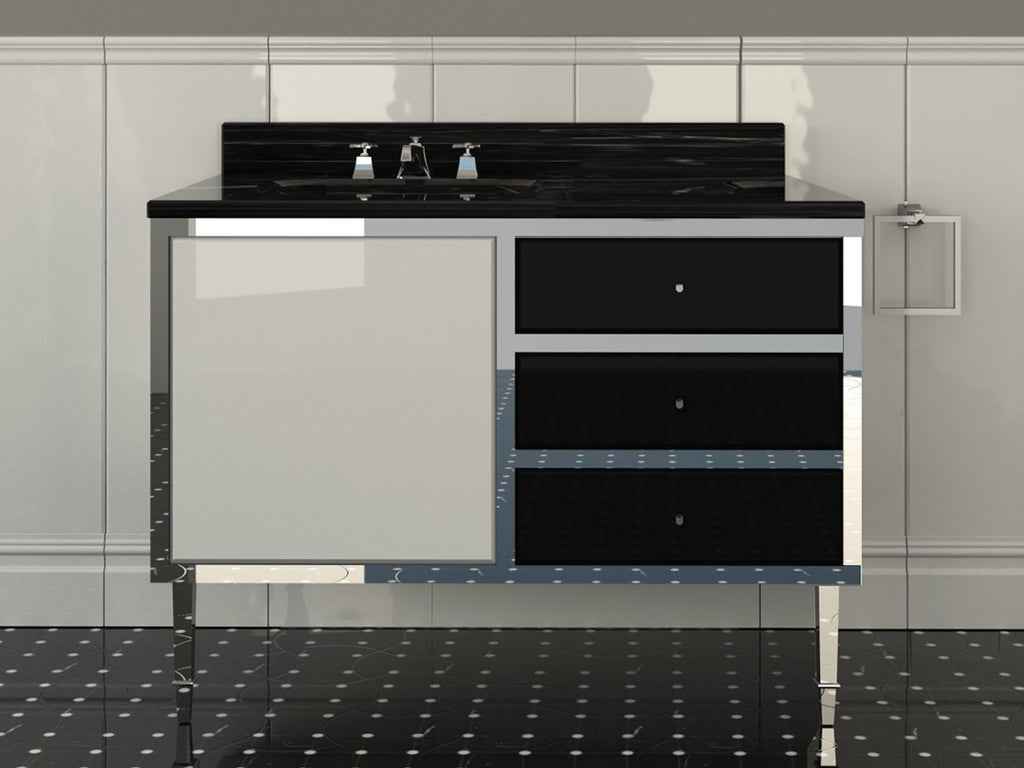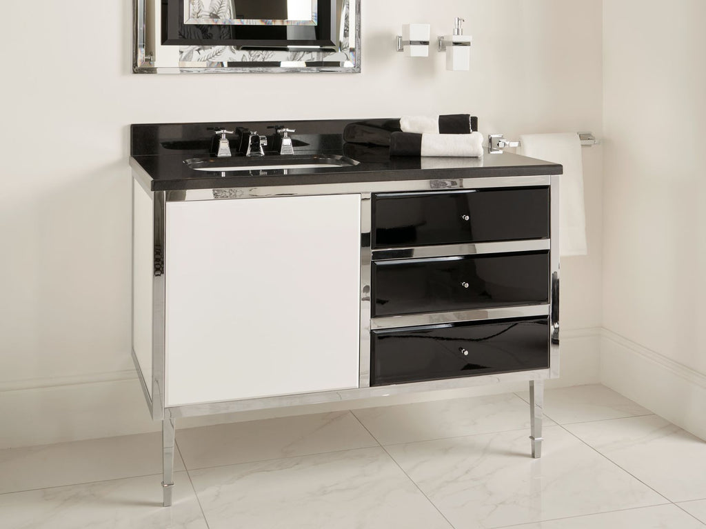 Jazz 2 is a washbasin unit which reinterprets the solid geometric figures and proportions of the Bauhaus architecture and transform them into bright mirror surfaces that outline their profiles. Its essential and squared base is characterized by the contrasting colours of a door and a chest of drawers in lacquered wood, available in the colours: deep black, pure white, cream, warm gray, with chrome, light gold or polished nickel finishes. The top in black Marquinha or white Carrara marble, rests on chromium-plated brass legs.
