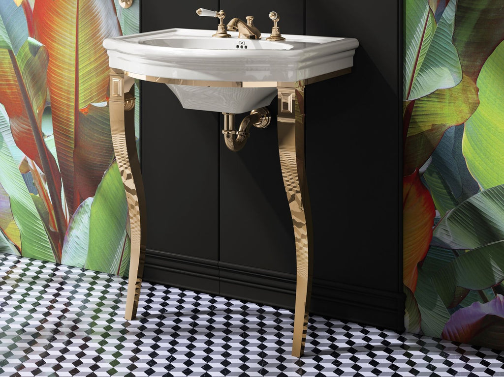 The curved form of the legs emphasizes the essence of the eighteenth-century sinuous lines and revisits them in a light contemporary spirit. Made of fused aluminium with turned brass elements, the bearing structure is available in chrome, light gold or polished nickel finishes. It is completed with the New Etoile porcelain basin.