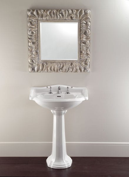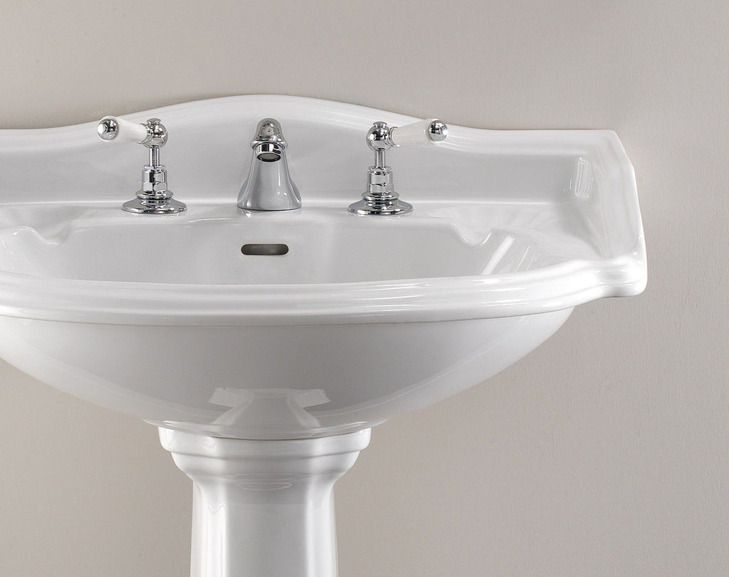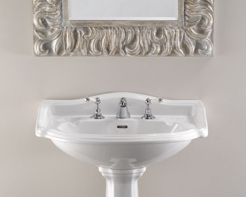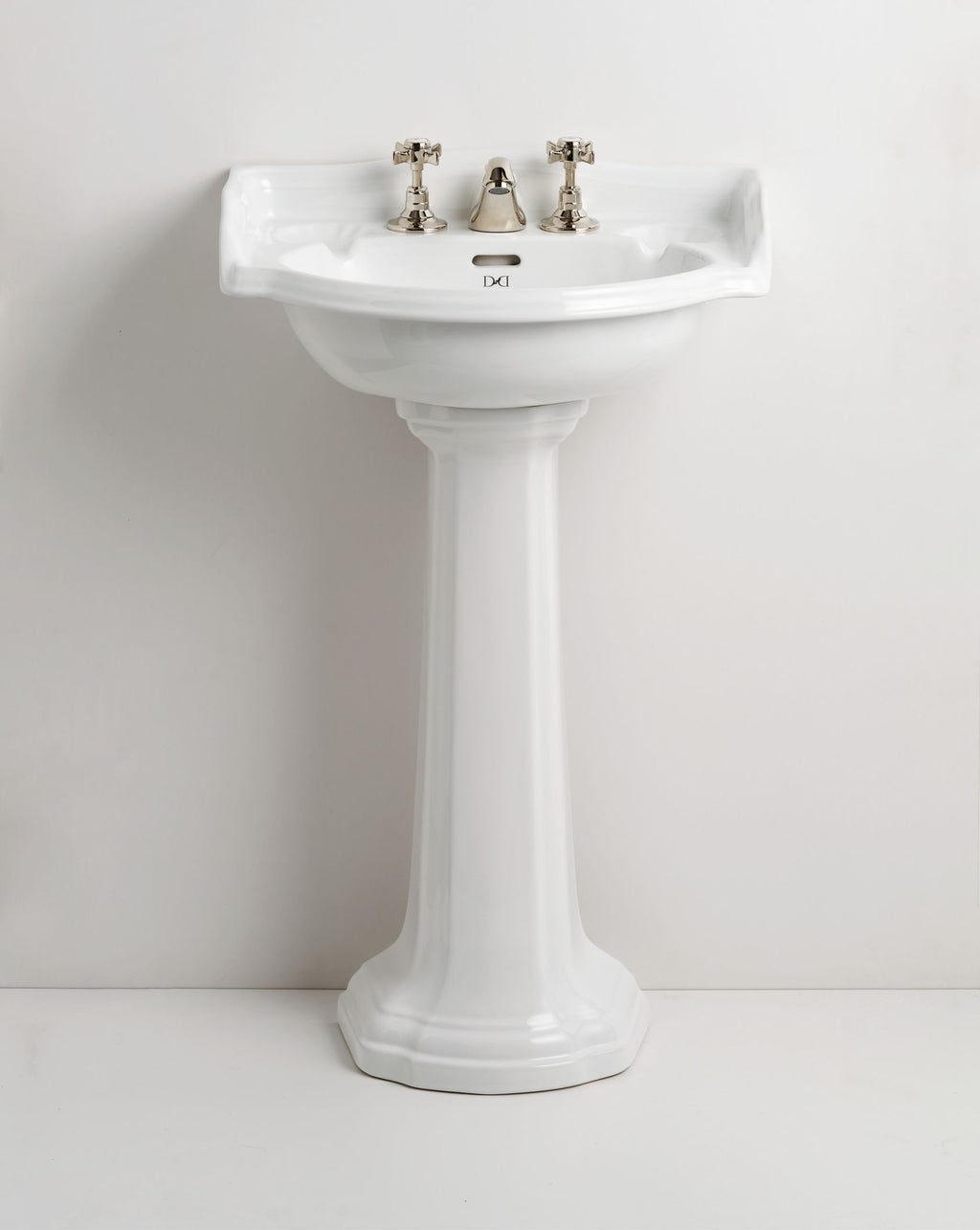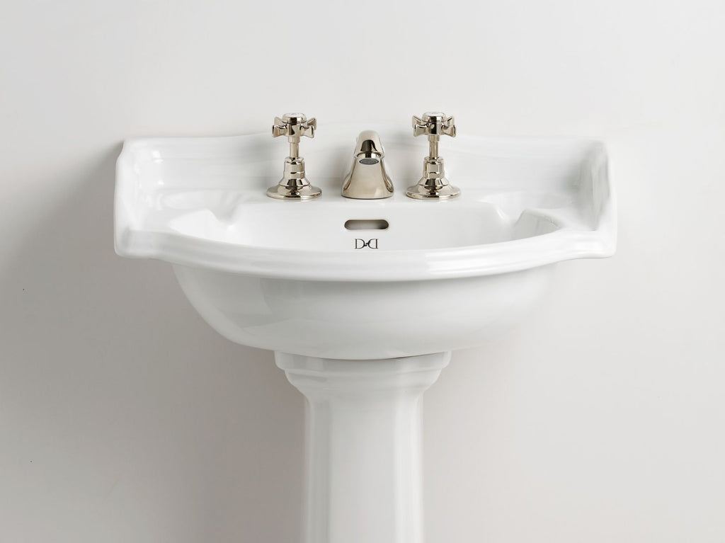 Large basin with pedestal in white ceramic. Dandy taps in chrome finish, also available in light gold and polished nickel.